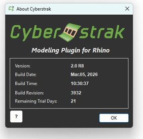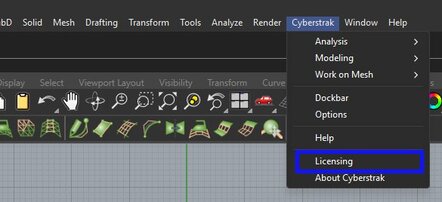 Wenn das Plugin erfolgreich installiert ist, können Sie Rhino 3D®, Version 7 bzw. 8 starten. Es erscheint eine Toolbar, von der aus die Cyberstrak Kommandos gestartet werden können.